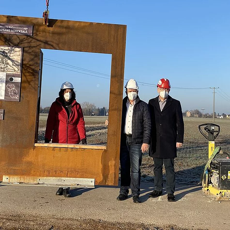 Damit wird die Grundidee deutlich: das Wissen rund um Wallensteins Lager soll unterhaltsam vermittelt und interaktiv erlebbar gemacht werden. Doch bei allem Unterhaltungswert, den der Erlebnisweg für Spaziergänger und Wanderer bieten wird, war es dem Kuratorium wichtig, die dramatischen Folgen der Auseinandersetzungen im Dreißigjährigen Krieg fundiert und angemessen zu beleuchten. Dass dies ganz gut gelungen sei, bestätigen die Bürgermeister der drei Kommunen beim Aufbau der Station, die sich mit dem „Leid der Bevölkerung“ auseinandersetzt. Die Stelen aus Cortenstahl mit den grafisch gestalteten Informationstafeln seien zudem ein Blickfang und passen gut in die Umgebung, zeigten sich die Bürgermeister vor Ort zufrieden mit der Umsetzung.