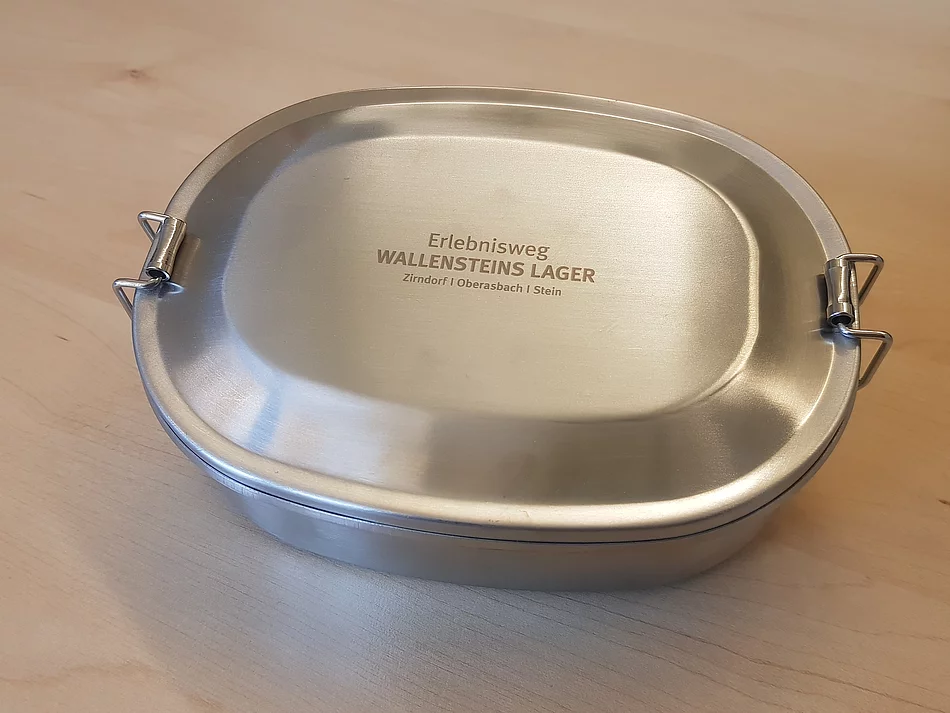 Proviantbox "Wallensteins Lager" aus Edelstahl mit der Aufschrift " Erlebnisweg Wallensteins Lager"