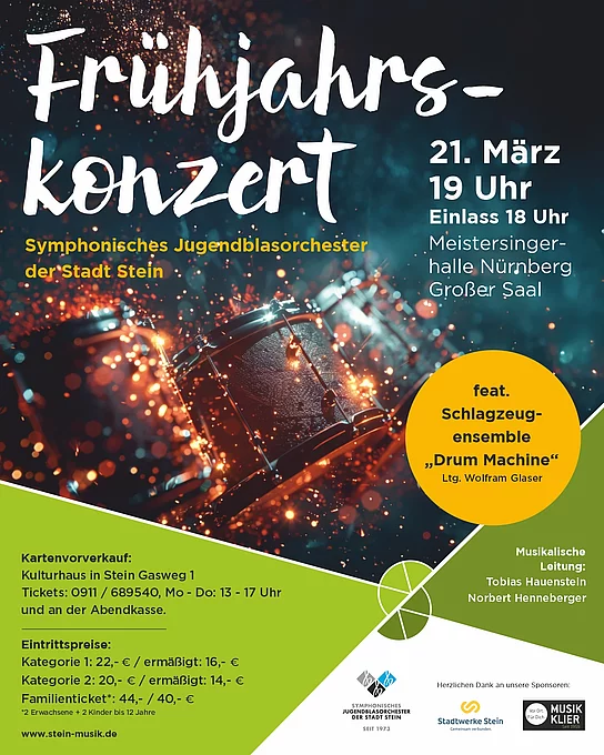 Freuen Sie sich auf ein abwechslungsreiches Programm, das unter anderem das Schlagzeugensemble "Drum Machine" der Musikschule Stein, unter der Leitung von Wolfram Glaser, präsentiert. Mit kraftvollen Rhythmen und außergewöhnlicher Klangvielfalt erwartet Sie ein unvergessliches Konzerterlebnis.