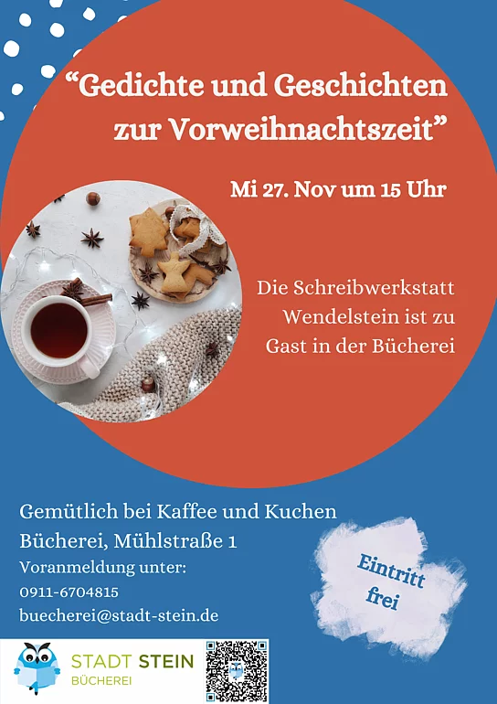 Am 27. November 2024 um 15 Uhr ist die Schreibwerkstatt Wendelstein wieder einmal zu Gast in der Bücherei Stadt Stein.