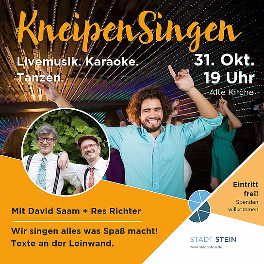 Allein Vorsingen war gestern! Deshalb trällern ab sofort alle gemeinsam, ohne Rücksicht auf Verluste oder falsche Töne - und zwar in der Alten Kirche in Stein, bei Bier oder einem anderen Getränk. Nur die Freude am Singen zählt! Gesungen wird alles, was Spaß macht. Und das nicht zu Plastikmusik aus der Konserve, sondern zu Livemusik von echten Musikern. Die Texte muss keiner auswendig kennen, die werden natürlich serviert.