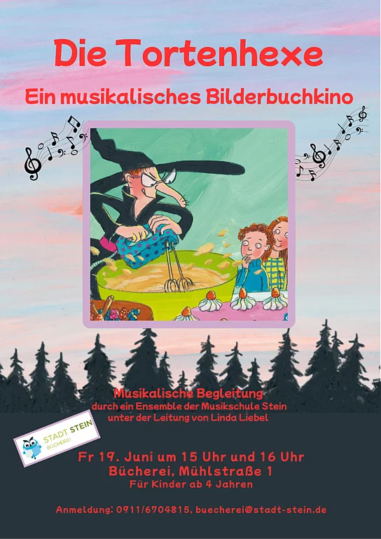 Die Bücherei lädt zu einem musikalischen Bilderbuchkino „Die Tortenhexe“ ein. Stimmungsvoll begleitet wird die Geschichte von einem Ensemble der Musikschule Stein unter der Leitung von Linda Liebel. Anmeldung : 0911 6704815, buecherei@stadt.steiin.de