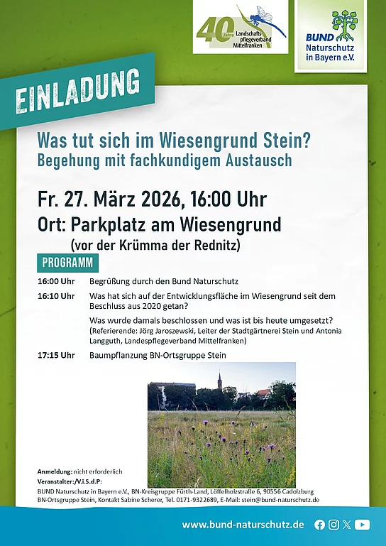 Die Entwicklungsfläche im Wiesengrund wird anlässlich des 50jährigen Bestehens der Kreisgruppe des BUND Naturschutz im Landkreis Fürth als nachhaltiges Projekt gewürdigt. Wir blicken zurück auf die damaligen Beschlüsse und deren Umsetzungsergebnisse bis heute. Die Stadtgärtnerei Stein und der Mittelfränkische Landschaftspflegeverband werden uns zeigen, was seit 2020 entstanden ist und wie es weiter geht.