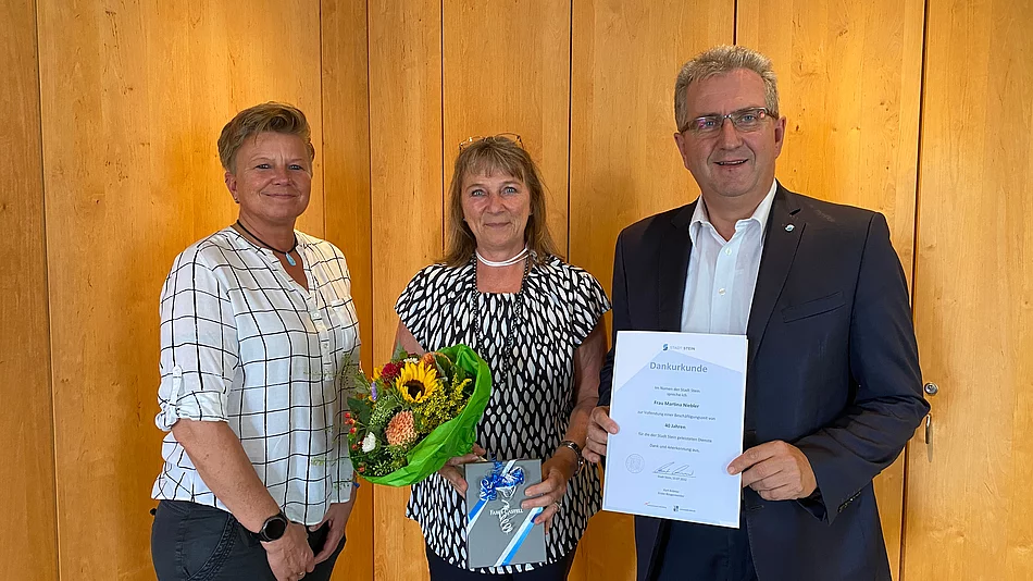 Ein schönes Dienstjubiläum gab es im Juli im Steiner Rathaus zu feiern, denn Martina Niebler ist jetzt seit 40 Jahren im öffentlichen Dienst beschäftigt.