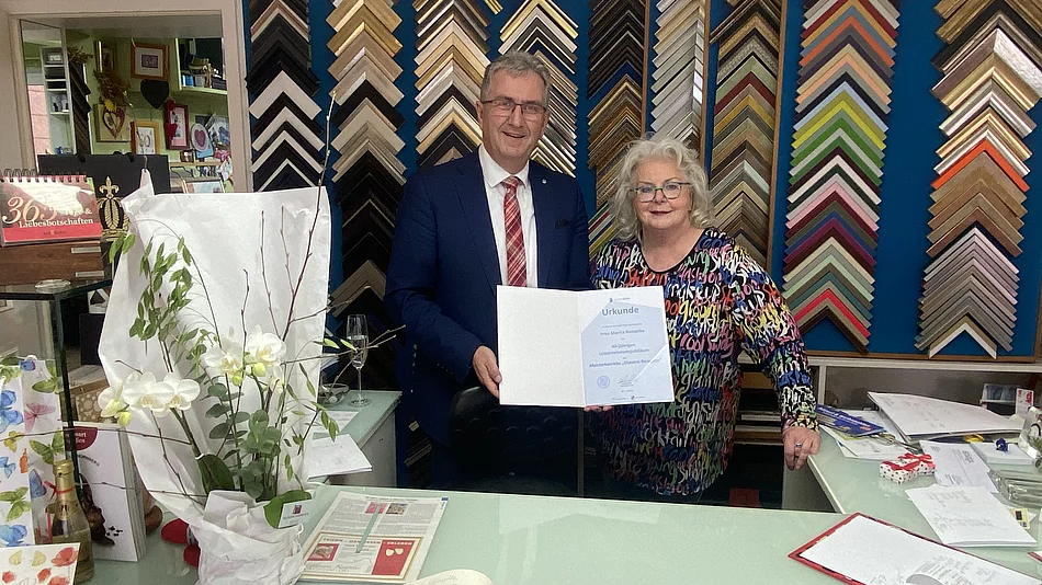 Seit vier Jahrzehnten ununterbrochen am selben Standort, hat das Unternehmen trotz aller Herausforderungen – von Straßenbaumaßnahmen bis hin zu einem Raubüberfall – seinen Weg konsequent weiterverfolgt. „Das kann mich nicht aufhalten“, sagt Inhaberin Marita Remptke, die mit Leidenschaft und Selbstbewusstsein ihr Geschäft führt und immer neue Pläne schmiedet. Eine besondere Erfolgsgeschichte ist die einer ihrer ersten Auszubildenden, die bis heute im Unternehmen als Meisterin tätig ist – ein Beweis für das familiäre Arbeitsklima und die gelebte Wertschätzung. Zum 40-jährigen Bestehen ließ es sich auch Steins Erster Bürgermeister Kurt Krömer nicht nehmen, persönlich zu gratulieren. Er trug sich ins Jubiläumsbuch ein, überreichte eine Urkunde sowie einen Blumenstrauß und dankte Marita Remptke für ihren jahrzehntelangen Einsatz. „Die Glaserei Remptke ist eine Institution in Stein“, so Krömer. „Frau Remptke hat hier über Jahrzehnte nicht nur ihr Handwerk mit Leidenschaft betrieben, sondern auch kulturelle Akzente gesetzt.“ Tatsächlich ist die Glaserei Remptke weit mehr als ein Handwerksbetrieb. Hunderte von Veranstaltungen hat Marita Remptke bereits organisiert – von Kunstauktionen über musikalische Abende bis hin zu außergewöhnlichen Ausstellungen. Und sie verspricht: Es werden noch viele weitere folgen. „Unser Ziel war es immer, die Welt ein bisschen bunter zu machen und einen Ort zu schaffen, an dem sich Menschen wohlfühlen“, so Marita Remptke.