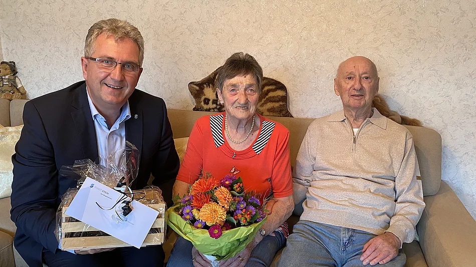 Über 60 Jahre gehen sie schon gemeinsam durch dick und dünn. Am 29. September feierten Johanna und Kurt Neusinger ihre Diamantene Hochzeit. Erster Bürgermeister Kurt Krömer besuchte das Ehepaar an ihrem Ehrentag und überreichte im Namen der Stadt Stein Geschenke und Blumen.