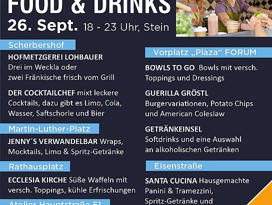 Die Lange Nacht der Kultur wird selbstverständlich auch wieder ein Abend zum Schlemmen. Die leckere Steiner Küche wird ergänzt durch ein abwechslungsreiches Angebot regionaler Foodtrucks. Verschiedene Stände versorgen die Gäste außerdem mit Getränken.