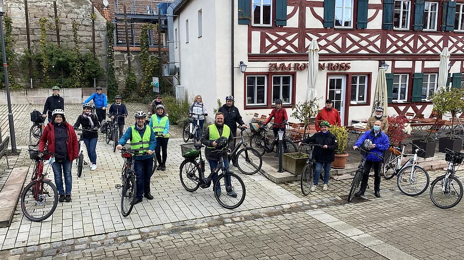Mit dem Beginn der herbstlichen Rad- und Wandersaison startete ein Team aus Bürgermeistern, Mitgliedern der Bauämter und Fahrradbeauftragen die Befahrung des Allianzrundweges. Der Rad- und Fernwanderweg erstreckt sich auf einer Länge von ca. 50 km über die Gemeinden Ammerndorf, Cadolzburg, Großhabersdorf, Oberasbach, Roßtal, Stein und Zirndorf im südlichen Landkreises Fürth. Bereits seit 15 Jahren führt der Rundweg Wanderer und Radfahrer durch die Region. Der Rundweg verbindet die Städte und Gemeinden sowie viele „Sterne der Allianz“, sprich kulturelle Highlights und schöne Naturschauplätze. Die Tour und seine Beschilderung sind dabei etwas in die Jahre gekommen. Ziel der Befahrung ist es, die Wegeführung auf den Prüfstand zu stellen und zu optimieren, um den Besuchern möglichst viele Sehenswürdigkeiten zeigen zu können. Die Befahrung wird in zwei Tagesetappen absolviert. Die erste Etappe, die über 27 km von Großhabersdorf über Roßtal und Stein nach Oberasbach führt, bereiste das Team der kommunalen Allianz am 6. Oktober mit den kommunalen E-Pedelecs. Die Tour startete am Parkplatz des Gasthauses Rotes Ross in Großhabersdorf. „Gerade in einem Jahr, in dem der Urlaub für viele in der Heimat stattfindet, ist es interessant zu sehen, welche schönen Radstrecken es hier bei uns in der Region gibt“, fasst Steins Erster Bürgermeister Kurt Krömer den Vormittag zusammen. „Wir möchten in den nächsten Monaten noch einiges an der Wegeführung verbessern, aber ich bin schon jetzt sehr zufrieden mit den Erlebnissen auf der Rundtour.“ Krömers Kollegin aus Oberasbach ergänzt: „Für uns als Bürgermeister war es wichtig, uns selbst ein Bild zu machen, von dem, was unterwegs geboten ist“, erklärt Bürgermeisterin Birgit Huber. „In unserer eigenen Gemeinde sind wir Spezialisten, aber gerade bei so einem gemeinsamen Projekt, möchten wir über den Tellerrand hinausschauen.“ Da Teamgeist und Gemeinschaftsgefühl bei der Tour im Vordergrund standen, endete die Tour nach drei Stunden bei einer warmen Suppe auf Einladung der Stadt Oberasbach im el café am Rathaus in 90522 Oberasbach. Im Frühjahr geht es von Oberasbach weiter über Zirndorf, Cadolzburg und Ammerndorf zurück nach Großhabersdorf. Hier geht es zur Tour