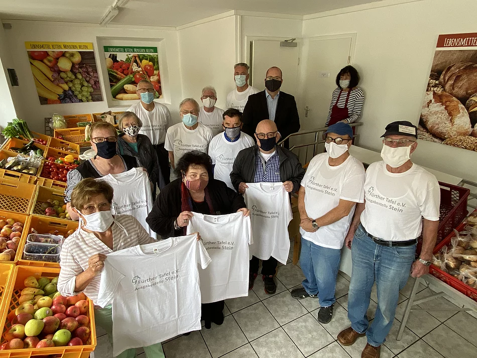 Seit vielen Jahren gehört die Ausgabestelle Stein der Fürther Tafel zur festen Anlaufstelle für bedürftige Bürgerinnen und Bürger. Für wenig Geld können sich die die über 100 registrierten Kunden an der "Steiner Tafel" ihre Taschen vollfüllen lassen. Zur Unterstützung der ehrenamtlichen Mitarbeiter hat nun eine Steiner Firma bedruckte T-Shirts gespendet.