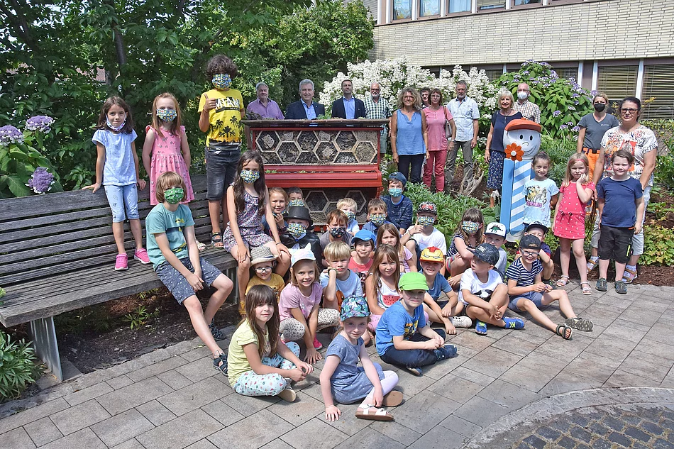 Bei dem Insektenhotel handelt es sich um ein Klavier, das jahrelang in einer Maschinenhalle stand. Bis zum 3. Mai 2021. An diesem Tag hat der“Steiner Gartenbauverein“ das Klavier entkernt und Waben für den oberen und unteren Teil passend aus Holz gezimmert. Anschließend ging es auf die Reise in den städtischen Hort in der Mühlstraße und den Kindergarten Gräfin Ottilie. Dort wurde das Klavier in den Pfingstferien von den Kindern mit Naturmaterialien befüllt. Zwischenzeitlich bekam das Instrument einen neuen Anstrich, außerdem wurde ein Dach gezimmert und die gefüllten Waben eingesetzt. Auf die Rückseite kamen gebohrte Holzstücke und zur Stabilisierung ist alles mit Hasengitter abgesichert worden. Die Klaviertasten wurden entfernt, mit Folie ausgelegt und mit Hauswurz bepflanzt, ebenso wie das Dach. All dies unter Federführung des Verein für Gartenbau und Landespflege Stein e.V. Die Idee dazu entstand als der Aufruf für die Teilnahme am bayernweiten “Wettbewerb Vielfaltsmeisterschaft“ für Obst und Gartenbauvereine erfolgte. Alles in allem wurden rund 45 Stunden investiert. Dabei haben 25 Kinder aus dem Hort und 22 Kindergarten- Kinder fleißig mitgeholfen.