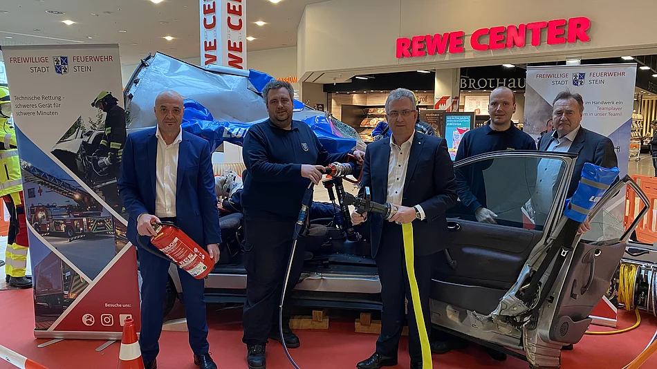 Eine freiwillige Feuerwehr lebt vom Mitmachen. Deshalb werben die Ehrenamtlichen der Feuerwehr in Stein um neue Mitglieder – mit einer Ausstellung, die zurzeit im Einkaufszentrum „Forum“ zu sehen ist. Dort wird ein verunfallter Pkw ausgestellt, mit dem eine Momentaufnahme einer technischen Rettung dargestellt wird. Steins Erster Bürgermeister Kurt Krömer und 1. Kommandant Dominik Datz von der Freiwilligen Feuerwehr informierten heute vor Ort über die spannende Arbeit.