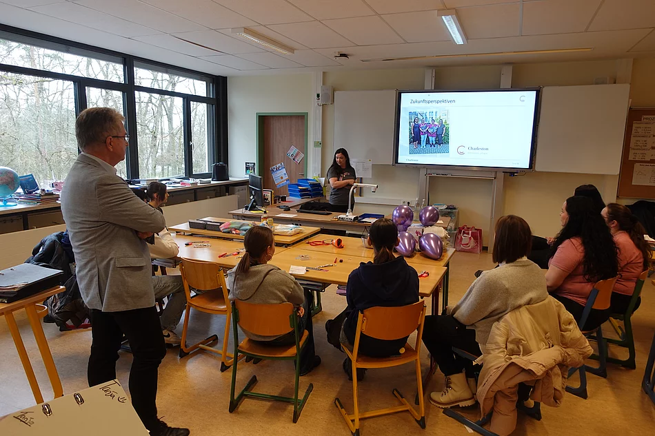 Die SMV brachte sich in die Gestaltung des Tages ein und übernahmen zusammen mit der Schulleiterin Frau Seegets und dem 1. Bürgermeister Kurt Krömer die Begrüßung der Gäste. Auch verschiedene Ehrengäste von der IHK, vom Gewerbeverein Stein und der Regional- und Wirtschaftsförderung des Landkreises Fürth interessierten sich für den Aktionstag. Mit Stehtischen und Loungemöbeln wurde der Flur zu einer Begegnungszone, um so eine gute Atmosphäre zum informellen Austausch anzubieten. Gemeinsam mit der Schulbäckerin konnte ein kleines Catering auf die Beine gestellt werden, das die Besonderheit des Tages unterstrich.