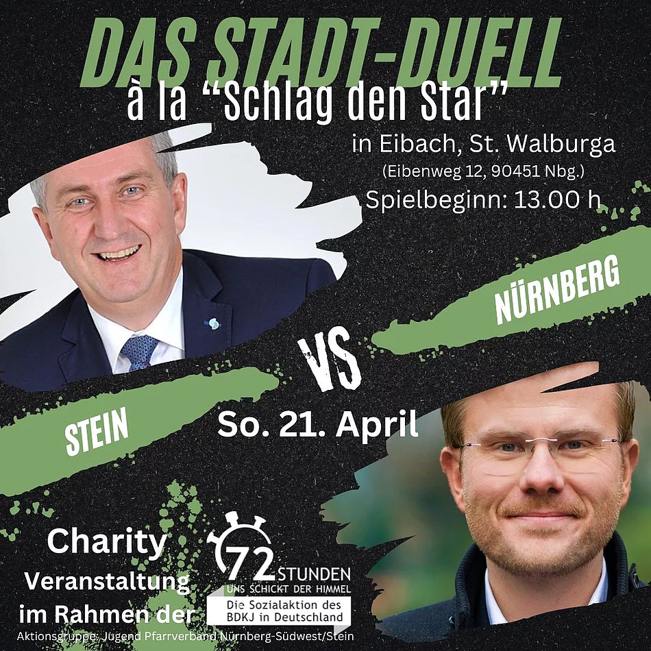Die Jugend des Pfarrverbandes Nürnberg-Südwest/Stein hat sich in Kooperation mit der KjG Eibach angemeldet und plant eine Charityveranstaltung a la „Schlag den Star“ im Laufe der 72 Stunden vorzubereiten und durchzuführen. Diese wird am Sonntagnachmittag 21. April in Eibach stattfinden. Nun ist es klar: die beiden (Ober-)Bürgermeister unserer Städte Stein und Nürnberg haben zugesagt Teil eines Stadt-Duells zu sein, bei dem Zweier-Teams gegeneinander antreten werden.