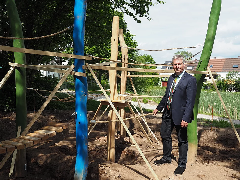 "Die Baumaßnahmen sind in vollem Gange. Die Spielgeräte werden zurzeit montiert, danach folgen die Fallschutzzonen und Grünflächen sowie der geplante Wasserlauf", so Erster Bürgermeister Kurt Krömer zufrieden über den Stand der Dinge. Auch der Weiher selbst muss noch bearbeitet werden: Dem wuchernden Schilfrohr muss Einhalt geboten werden. Jedoch erst dann, wenn die dort lebenden Frösche ihre Laichzeit beendet haben und eine Gefährdung der Frösche und anderer Tiere, die beispielsweise im Schilf brüten, ausgeschlossen ist. Es ist vorgesehen, diese Maßnahme nach Rücksprache mit den Fachstellen voraussichtlich im Herbst 2019 durchzuführen.