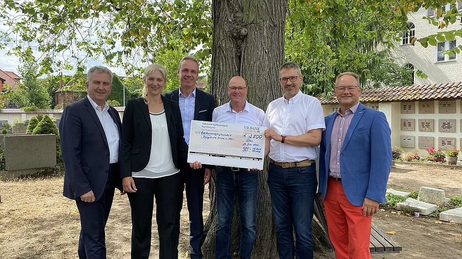 Investiert wird die Summe in eine Rundbank unter einer der Ulmen auf dem Alten Friedhof. Anwesend bei der Scheckübergabe war unter anderem auch Erster Bürgermeister Kurt Krömer: "Ich möchte mich recht herzlich bedanken. Auch für die tolle Bildauswahl, die am Ende darüber entscheidet, wie gut sich der Kalender verkauft. Und ihr hat Erwin Kohlbeck erneut ein sehr gutes Händchen bewiesen, was an der Auflage und der hohen Spendensumme gut zu erkennen ist. Mein Dank richtet sich auch an Charly Weisslein für die tolle Druckqualität. Das Spiel von alt und neu kommt sehr gut an, weil es eben auch schöne Erinnerungen an vergangene Tage weckt", so Krömer. "Es freut uns, das wir unseren Beitrag leisten können und es den Bürger:innen in diesem Jahr mit der Rundbank zu Gute kommt. Wenn man in diesem Bild bleiben möchte ist es einfach eine runde Sache", lobte auch Stefan Walz von der VR Bank Nürnberg, die den Steiner Kalender seit vielen Jahren finanziell unterstützen, sodass der Erlös für einen wohltätigen Zweck verwendet werden kann. „Ich kann mich dem Dank nur anschließen. Es ist ein tolles Projekt. Schon bei vielen Gemeindemitgliedern habe ich bei Hausbesuchen den Kalender gesehen. Diese Verbundenheit der Menschen mit den Orten und Häusern die es damals noch gab ist ganz stark ausgeprägt. Der Alte Friedhof ist ein Ort auf dem man sich trifft und austauscht. Und hierfür ist die Rundbank unter der großen Ulme eine tolle Sache. Das dieses Projekt nun mit dieser Spende bald umgesetzt werden kann freut mich sehr“, so Ralph Baudisch, Pfarrer der Martin-Luther Gemeinde.
