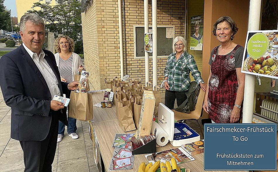 Mit einer Fairschmecker Frühstücks Tüte können sich Steiner Bürgerinnen und Bürger mit Freunden oder Familie zu Hause ein faires Frühstück zubereiten. Kaffee oder Tee, Zucker, Kakao, MangoMarmelade, ein herzhafter Brotaufstrich und Honig kommen in die Tüte. Mitglieder der Steuerungsgruppe bieten die Tüten für 12€ an - und auch noch andere Frühstückszutaten aus fairem Handel können gekauft werden.