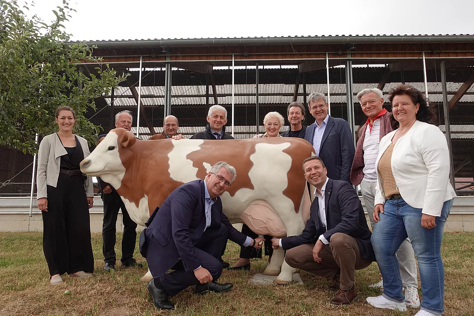 In Stein testete Bürgermeister Krömer gemeinsam Landrat Dießl seine Fähigkeiten an der Melkkuh und verwies auf die Thementafel „Bioenergie“. Mit Blick auf die Biogasanlage wird hier deren Funktion erklärt und besonders anschaulich, dass die Landwirtschaft nicht nur in der Lebensmittelproduktion systemrelevant ist.