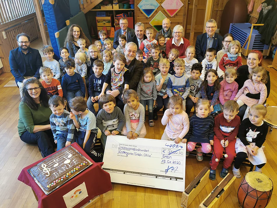 Ursprünglich stand auf dem Scheck die Summe 3500 Euro. Spontan vor Ort wurde der Betrag um 500 Euro erhöht. Das Geld vom Lions-Club Nürnberg Meistersinger wird direkt in die musikalische Früherziehung gesteckt. Seit vielen Jahren werden die Kinder von Lehrern der Steiner Musikschule unterrichtet – ohne das die Eltern einen Beitrag leisten müssen. Finanziert nur durch Spenden, wie jetzt beispielsweise vom Lions-Club, ist somit auch Menschen aus sozial schwächeren Verhältnissen dieser Unterricht möglich. Bei der Scheckübergabe hob Steins Erster Bürgermeister Kurt Krömer auch den pädagogischen Wert dieses Unterrichtes hervor: "Da der Kindergarten einen hohen Migrationshintergrund hat, wird durch dieses Projekt die sprachliche Barriere auf eine musikalische und kreative Art überwunden. Es ist ein rundum gelungenes Projekt, welches die Stadt vor fast zehn Jahren angestoßen hat", so Krömer. Warum der Lions-Club Meistersinger ausgerechnet für die musikalische Früherziehung des Steiner Kindergartens spendet, ist recht einfach erklärt: "Wie hier durch den Unterricht die Integration gelebt wird und das auch mit einer Nachhaltigkeit stattfindet, hat uns sehr beeindruckt. Und auch, das begabte Kinder, die kein Geld haben, die Möglichkeit bekommen eine musikalische Karriere zu machen", so der Lionsclub-Beauftragte Jürgen Rühr. Als kleines Dankeschön für die Spende von 4000 Euro gab es vom Kindergarten noch einen selbstgebackenen Kuchen und passend zu diesem Nachmittag von den Kleinen ein schönes Lied.