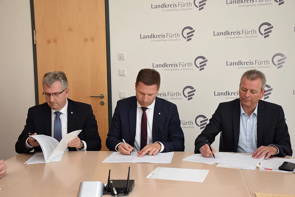 Die Stadt Nürnberg, die Stadt Stein und der Landkreis Fürth wollen eine sogenannte intermodale Machbarkeitsstudie beauftragen. Ausschlaggebend für die Initiative war die Aufnahme der Ortsumgehung Stein in den Bundesverkehrswegeplan. Eine entsprechende Vereinbarung unterzeichneten im Landratsamt in Zirndorf Nürnbergs Oberbürgermeister Dr. Ulrich Maly, Landrat Matthias Dießl und Steins Bürgermeister Kurt Krömer. „Ziel ist eine verkehrsmittelübergreifende, gesamtwirtschaftliche Betrachtung vor dem Hintergrund eines optimalen Nutzens für alle Beteiligten”, fasste Landrat Matthias Dießl zusammen und freute sich, dass die Untersuchung nun in Auftrag gegeben werden kann. Dabei reichen die möglichen Maßnahmen, die untersucht werden, zum Beispiel von einer Ortsumgehung oder einer Pförtnerampel vor Stein bis zu einer U-Bahn Verlängerung von Nürnberg nach Stein oder einer Seilbahn. „Aufgabe ist dabei, die durch die derzeitige Verkehrsbelastung bestehende negative Situation der Anwohner in Nürnberg und Stein bestmöglich zu verbessern”, betonte der Landrat.
