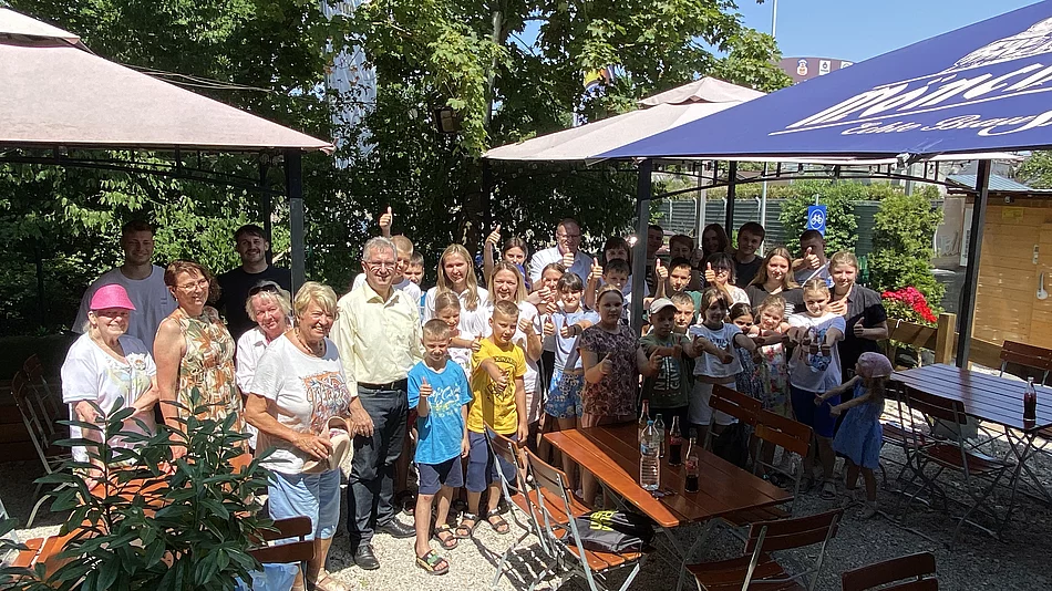 Zur Begrüßung in der Faberstadt waren alle Kinder und Betreuerinnen in den Biergarten „Steiner Gärdla“ eingeladen, wo Erster Bürgermeister Kurt Krömer im Namen der Stadt Stein zum gemeinsamen Pizzaessen eingeladen hatte. „Ich wünsche euch einen tollen Aufenthalt in unserer Region, viele interessante Ausflüge und unbeschwerte Ferien“, so Krömer. Außerdem dankte er allen, die diese Aktion erst möglich machten: den Organisatoren in Stein und Tschernobyl, den Betreuerinnen sowie den Gastfamilien, die dem Aufruf der Initiative gefolgt sind.