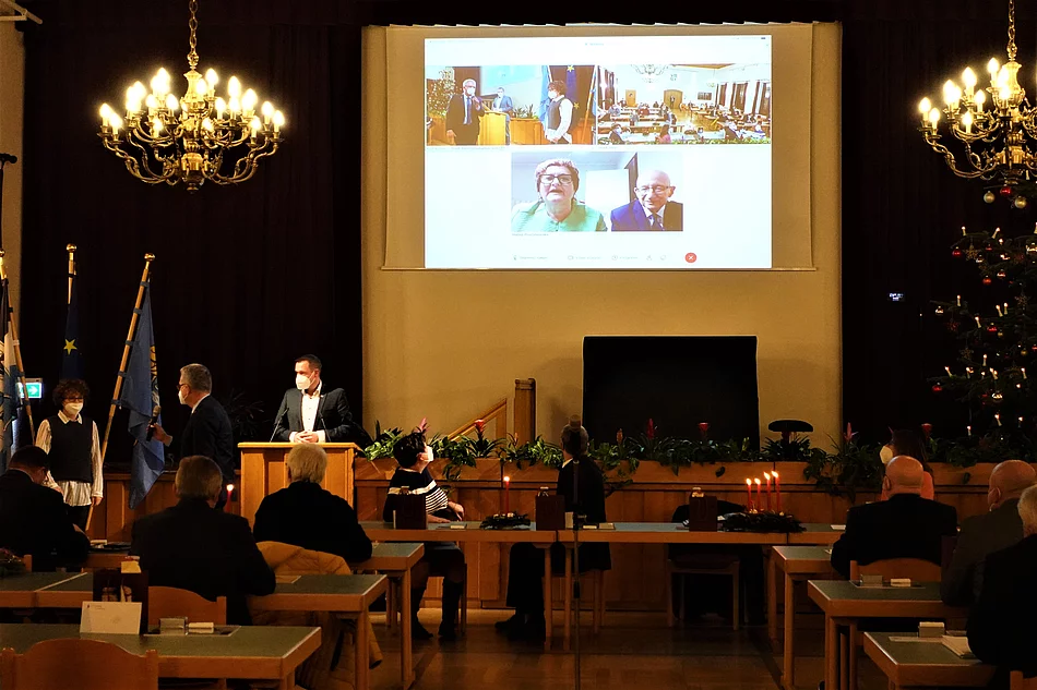 Schon traditionell wird die jeweils letzte Sitzung des Stadtrates im Jahr genutzt, um auf die letzten 12 Monate des Wirkens zurück zu blicken und Résumé zu ziehen. So auch in diesem Jahr in der Alten Kirche in Stein. Begonnen hat der Abend allerdings mit einer Liveschaltung in die polnische Partnerstadt Puck.