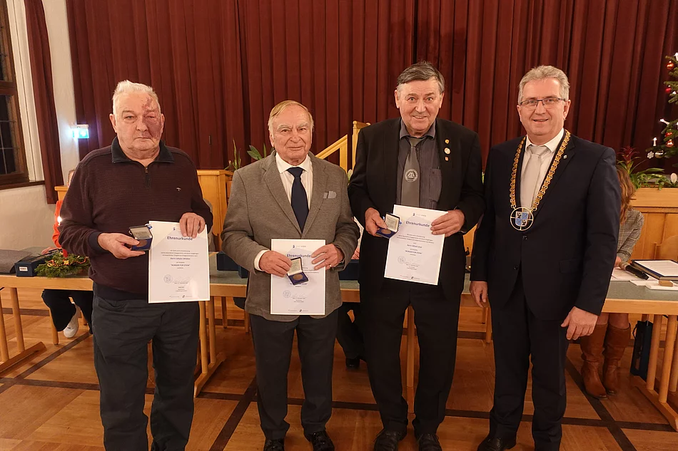 Dieses Jahr erhielten Alfred Lösel, Lothar Schumann und Johann Winkler eben jene Medaille. Alle drei sind seit über vierzig Jahren als Feldgeschworene, sogenannte Siebener, tätig und setzen sich seit Jahrzehnten mit großem Engagement für die Stadt und ihre Gemeinschaft ein.