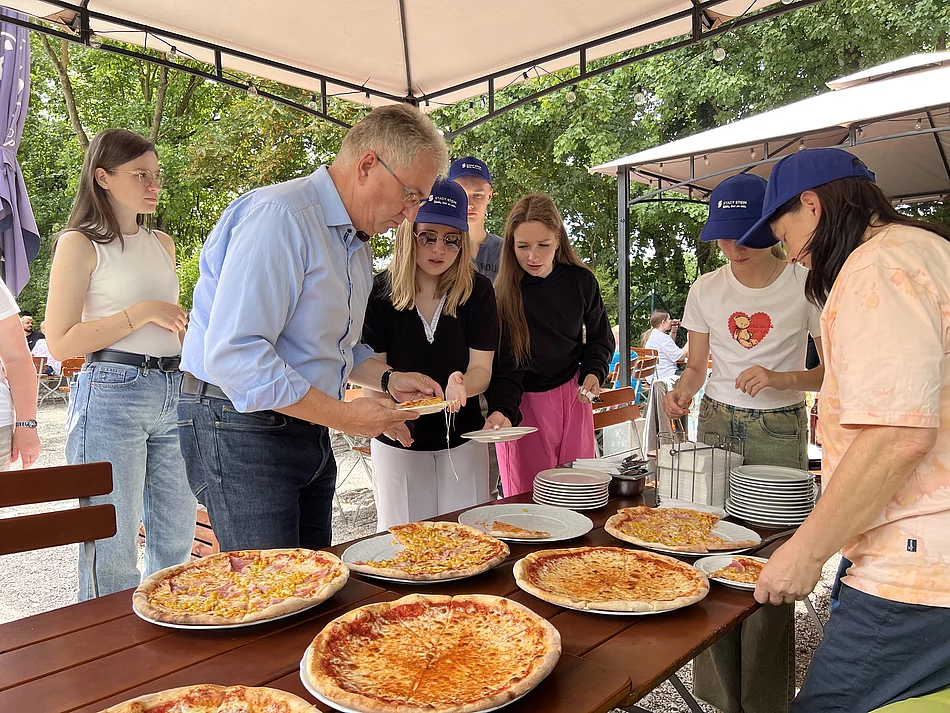 Ein Höhepunkt des Aufenthalts war jetzt das gemeinsame Pizzaessen im Steiner Gärdla, zu dem Erster Bürgermeister Kurt Krömer eingeladen hatte. Mit kleinen Geschenken – von der Stadt Stein, der Sparkasse Fürth sowie dem Forum Stein gestiftet – sorgte Krömer für große Freude bei den Kindern.