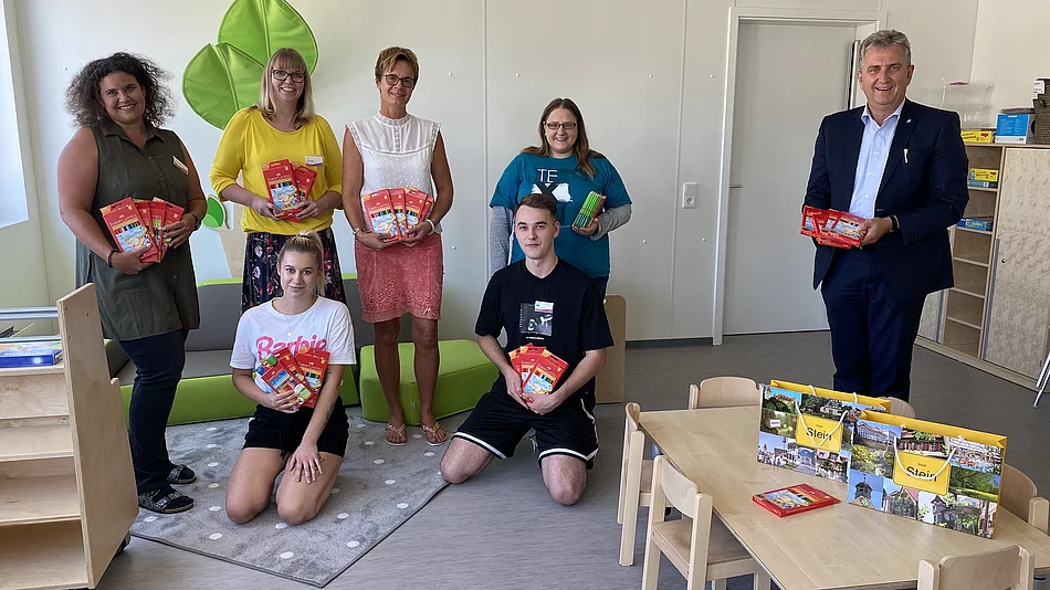 Natürlich steht erst einmal die Eingewöhnungsphase an. Damit diese leicht fällt, haben die Kleinen nun auch das entsprechende Malzeug dafür. Überreicht wurden die vielen Stifte aus dem Hause Faber-Castell von Ersten Bürgermeister der Stadt Stein Kurt Krömer: "Damit gut gearbeitet werden kann und die Wände nicht mehr so kahl sind, ist es mir eine Freude Ihnen diese Stifte überreichen zu können. An dieser Stelle möchte ich mich auch für den Einsatz und die Hingabe bedanken, die jetzt schon zu spüren ist", so Krömer bei seinem Antrittsbesuch im Eichenweg. Aktuell werden ab dem heutigen Tag 15 Kinder in der Krippe betreut und 35 Kinder im Kindergarten. Auch wenn es sich "nur" um eine Interimskindertagesstätte in Modulbauweise handelt, ist das 6-köpfige Team bereits begeistert. Dazu tragen vor allem die hellen Räume, der große Garten und die gute Zusammenarbeit mit der Stadt Stein bei, so der Tenor des Teams. Wir wünschen den Eltern, Mitarbeitern und vor allem den Kindern eine gute Eingewöhnung und viel Freude unter anderem beim Malen.