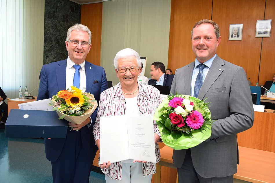 Martha Koch aus Stein wurde für ihr außergewöhnliches ehrenamtliches Engagement geehrt. Landrat Bernd Obst überreichte der 89-jähringen das Ehrenzeichen des Bayerischen Ministerpräsidenten für Verdienste im Ehrenamt.