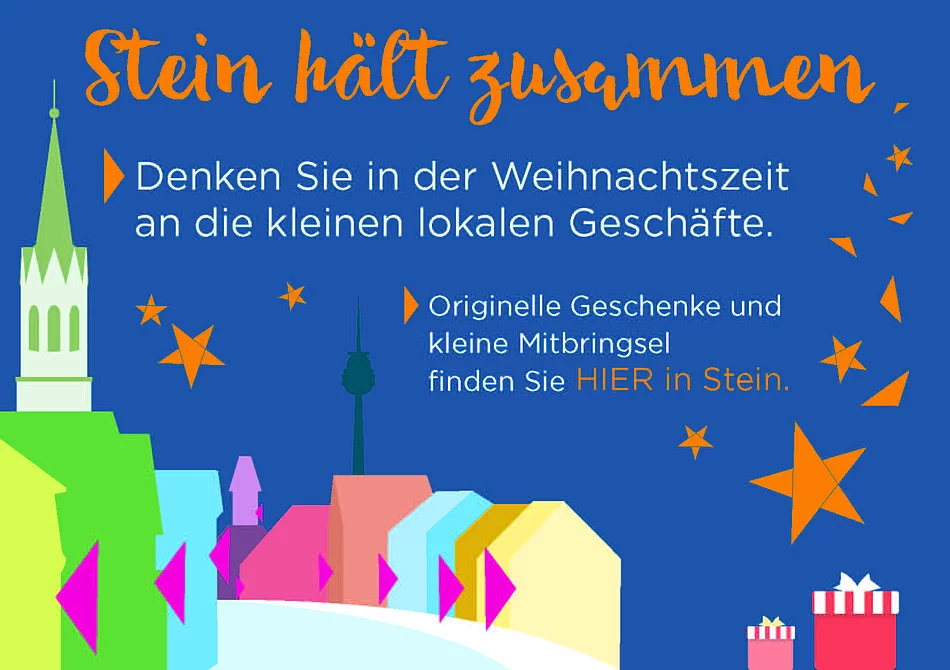 Jeder Euro, den Sie in einen Kaffee oder in ein Geschenk in Stein investieren, trägt zum Erhalt der Geschäftsvielfalt der Steiner Innenstadt bei. Kleine Läden bestimmen unser Stadtbild und machen es erst besonders. Stein bietet eine Vielfalt an Fachgeschäften mit erstklassiger Beratung. Geschenkartikel und Deko-Bedarf, Blumen und Bekleidung, Fahrräder und Fahrradzubehör, Spielwaren, Wellness und Kosmetik – fast jeder Geschenkewunsch lässt sich in Stein erfüllen. Durch kleine, liebevoll eingerichtete Läden stöbern, ins Gespräch kommen und Neues entdecken ist eine tolle Erfahrung. Auch der Umwelt zuliebe ist das lokale Einkaufen sehr viel besser, als online Geschenke zu bestellen.
