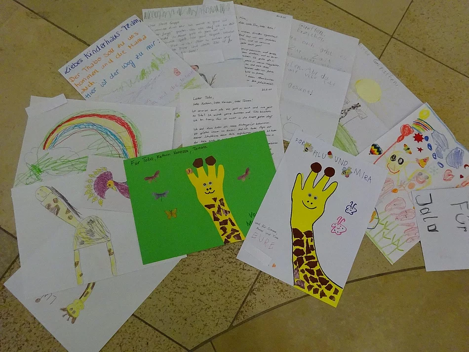 Liebe Kinder, liebe Eltern, Letzte Woche haben sich ja unsere Giraffen schon bei euch gemeldet und wir haben viel Post von Euch bekommen. Dankeschön, wir und die Giraffen haben uns sehr gefreut. Nun wollen auch wir Erzieher uns bei euch melden. Uns geht es allen gut- nur im Kindergarten ist es sehr einsam ohne Euch! Heute schicken wir euch ein Briefkastenbuch mit. Wie der Name schon sagt, könnt ihr in diesem Buch zunächst eine Seite gestalten und dann weiter wandern lassen. Von Briefkasten – zu Briefkasten. Wir wünschen Euch viel Spaß und freuen uns von Euch zu hören. Euer Kinderhausteam