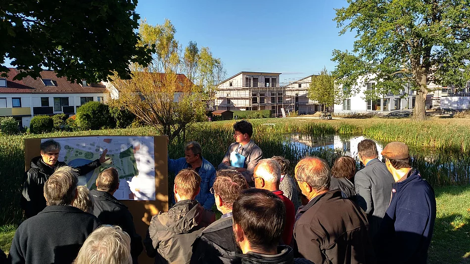 Am 25. September fand die 2. Planwerkstatt "Deutenbacher Weiher" an der Weizenstraße statt. Rund 30 Bürgerinnen und Bürger waren vor Ort erschienen, um sich den Entwurf für das Areal anzusehen und weitere Ideen zu diskutieren. An einem ersten Gespräch und der 1. Planwerkstatt hatten bereits im Oktober 2016 interessierte Bürgerinnen und Bürger teilgenommen. Die Vorschläge, Ideen und Wünsche, die damals eingebracht wurden, sind zwischenzeitlich - und soweit es möglich war - in die neue Planung eingearbeitet worden. Der Entwurf sieht drei neue Spielbereiche vor: Ein Bereich für Kleinkinder, ein Kletterbereich für größere Kinder sowie eine Schaukel-Landschaft. Zusätzlich soll ein Wasserspielfeld mit einem angelegten Bachlauf als "Wasser- und Matschbereich" entstehen. Außerdem wird der angrenzende Sportplatz optimiert - also vergrößert, um 90 Grad gedreht und mit einem Ballfangzaun ausgestattet. Nach kurzem Protest eines Bürgers war sich die überwiegende Mehrheit der anwesenden Bürgerinnen und Bürger einig, dass "Kinderlärm kein Lärm ist", wie Erster Bürgermeister Kurt Krömer entschlossen festhielt. Beim ersten Dialog im Oktober 2016 hatte sich die Bürgerschaft vor allem gewünscht, dass bei der Neugestaltung Kinder und deren Bedürfnisse im Vordergrund stehen. "Diesen Wünschen sind wir sehr gerne nachgekommen, denn natürlich ist es auch uns ein Anliegen, den Kindern in der Umgebung gerecht zu werden", so Krömer. Vor allem mit Blick auf das angrenzende Neubaugebiet erhofft man sich, dass der neue Spiel- und Bolzplatz gut besucht sein wird. Betont wurde auch der Respekt vor der Natur, insbesondere vor den zwei großen Eichen, die unter Naturdenkmalschutz stehen. Die Grundzüge des Areals sollen erhalten bleiben. "Das bedeutet, dass die neu geschaffenen Spielbereiche natürlicherweise durch das Wurzelwerk der Eichen und das Ufer des Weihers begrenzt werden", erklärte Landschaftsarchitekt Klaus Scheuber von der "Arge Stadt & Land". Zusätzlich soll um den Weiher herum ein Weg angelegt werden, an dem Ruhebänke zu finden sind, sodass nicht nur ein Ort des Spielens für Kinder, sondern auch ein Ort der Ruhe für Menschen jeden Alters geschaffen wird. Die Pläne werden im Oktober den Mitgliedern des Bauausschusses vorgelegt. Im Frühjahr 2019 soll auf dem Areal an der Weizenstraße der Spatenstich erfolgen.