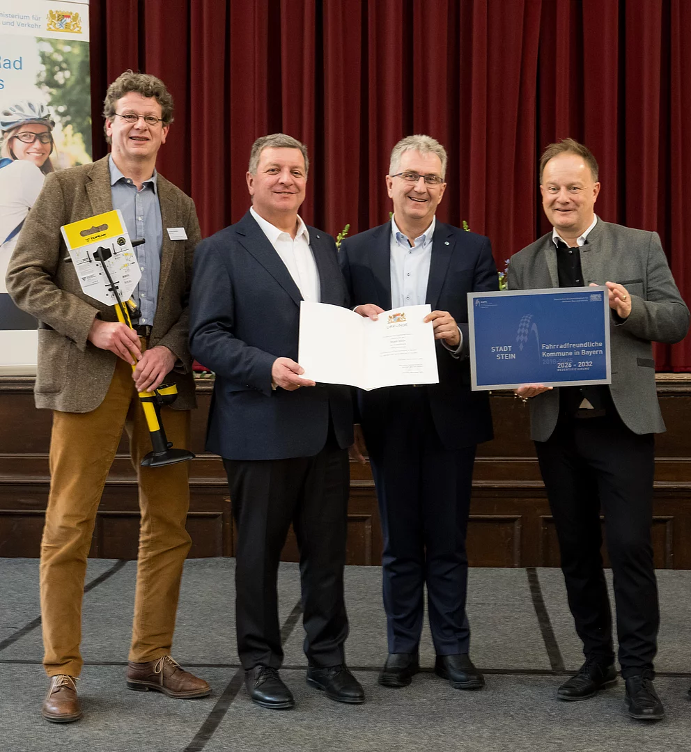 Im Rahmen der Veranstaltung der Arbeitsgemeinschaft fahrradfreundliche Kommunen in Bayern e.V. (AGFK Bayern) wurden insgesamt zwölf Kommunen neu ausgezeichnet und fünf – darunter die Stadt Stein – offiziell rezertifiziert. Die Stadt Stein hat den anspruchsvollen Prozess erfolgreich durchlaufen und darf das Qualitätssiegel nun bis zum Jahr 2032 führen. Verkehrsminister Bernreiter lobte das Engagement der ausgezeichneten Städte als „Vorbild für ganz Bayern“ und betonte, dass ein starker Radverkehr essenziell für eine lebenswerte Heimat sei.