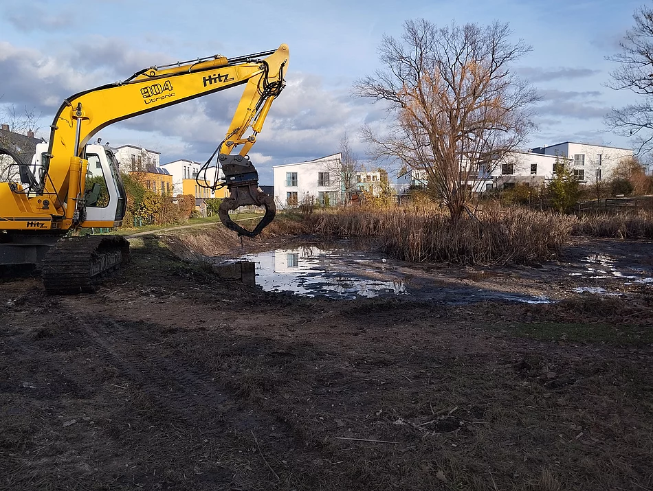 Anfang November wurde der Weiher Weizenstraße von Schlamm und übermäßigen Röhrichtbewuchs befreit. Die Stadtgärtnerei Stein hatte sich bereits Ende 2024 zu der Maßnahme entschieden und entsprechende Mittel im Haushalt beantragt.