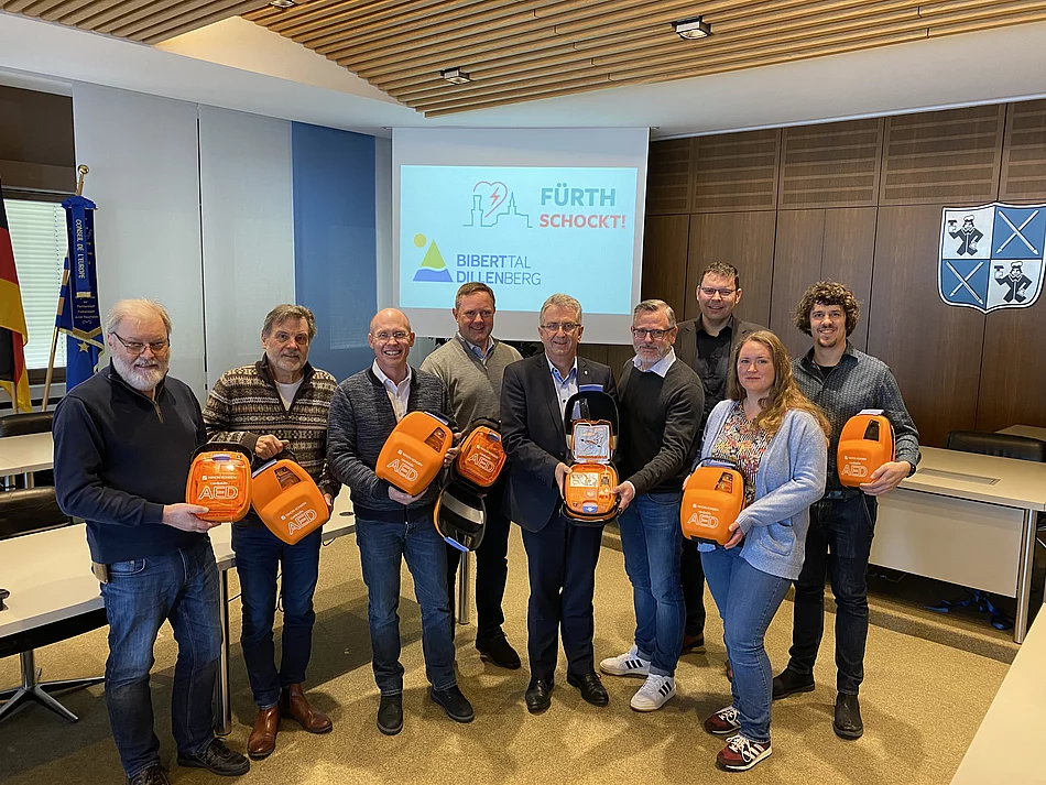 Ein Zeichen wollten die sechs Bürgermeister der Kommunalen Allianz Biberttal-Dillenberg setzen. Deshalb wurde im Rahmen des Regionalbudgets von den sechs ILEK-Gemeinden der Kommunalen Allianz Biberttal-Dillenberg jeweils ein automatisierter externer Defibrillator, kurz AED, angeschafft. Die Allianz-Kommunen möchten sich durch diesen Beitrag für mehr Herzsicherheit im Allianzgebiet einsetzen. „Die AEDs sollen in das Projekt „Fürth schockt!“ der Arbeitsgemeinschaft Notfallmedizin Fürth (AGNF) e. V. integriert werden, um die Überlebenszahlen nach einem plötzlichen Herzstillstand in den sechs Kommunen zu erhöhen“, so Steins Erster Bürgermeister und Sprecher der Kommunalen Allianz Kurt Krömer. Der Aufbau eines flächendeckenden AED-Netzwerkes im Landkreis und in der Stadt Fürth ist dabei das zentrale Element. Ergänzt wird dies durch den nicht weniger wichtigen Aufbau eines Systems zur Ersthelferaktivierung sowie durch Maßnahmen zur Sensibilisierung und der Verankerung von Trainingsprogrammen in der Bevölkerung.