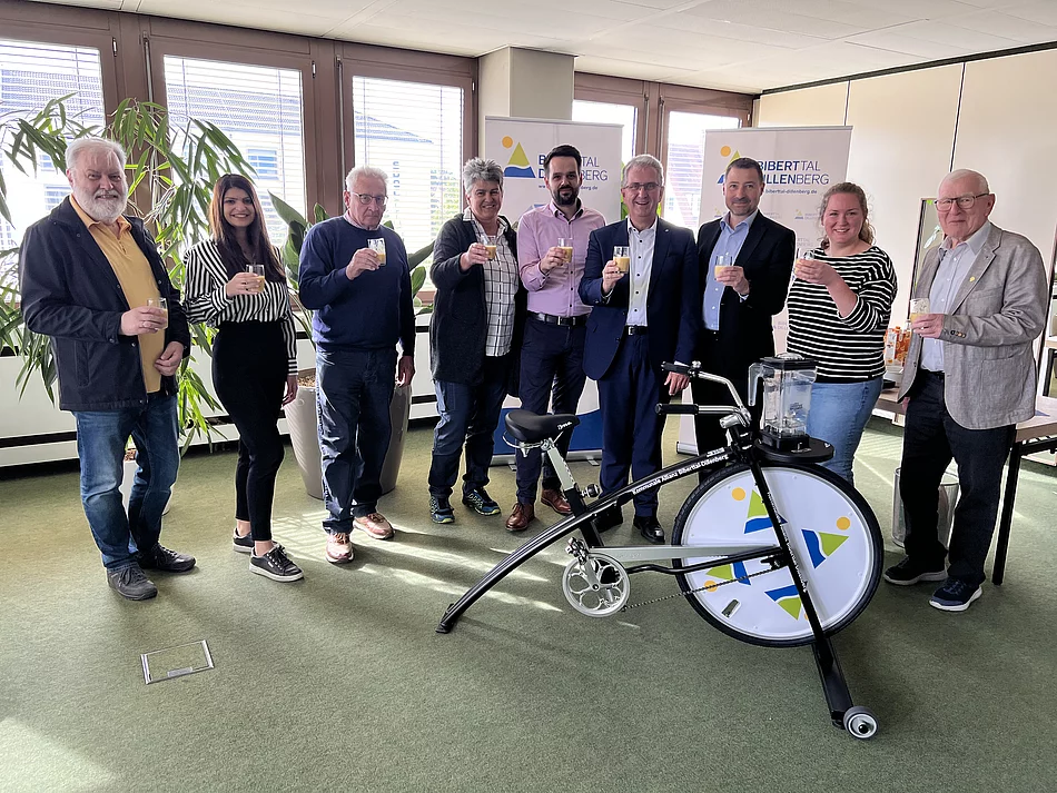 Bei der jüngsten Sitzung der Kommunalen Allianz Biberttal-Dillenberg wurde das neue Smoothie-Bike vorgestellt. Sogleich hieß es: In die Pedale treten und losradeln für den Smoothie! Kurt Krömer, Sprecher der Kommunalen Allianz Biberttal-Dillenberg und Erster Bürgermeister der Stadt Stein, probierte bei der Sitzung das neue Fahrrad aus und freute sich: „Mit dem Smoothie-Bike setzen wir ein Zeichen für eine gesunde und nachhaltige Lebensweise. Es ist schön zu sehen, wie viel Spaß es macht, gemeinsam etwas Gutes für unsere Gesundheit und die Umwelt zu tun.“ Auch Oberasbachs Bürgermeisterin Birgit Huber trat begeistert in die Pedale und mixte einen fruchtigen Smoothie. Das Ergebnis schmeckte allen Teilnehmern sehr gut. Frisch gestärkt konnten Sie die Beratungen beginnen.