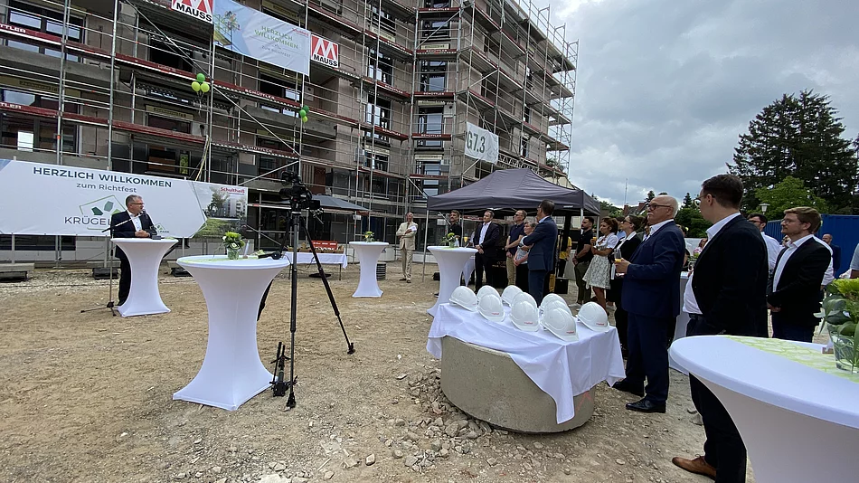 Erst vor gut neun Monaten wurde die Grundsteinlegung für die Bebauung des ehemaligen Krügel-Areals in Stein bei Nürnberg gefeiert. Am 30. Juni kamen erneut zahlreiche geladene Gäste auf dem Grundstück an der Deutenbacher Straße zusammen, um auf die Erreichung des nächsten Meilensteins anzustoßen: Die Rohbaufertigstellung von 69 geförderten Wohnungen und der Kindertagesstätte.