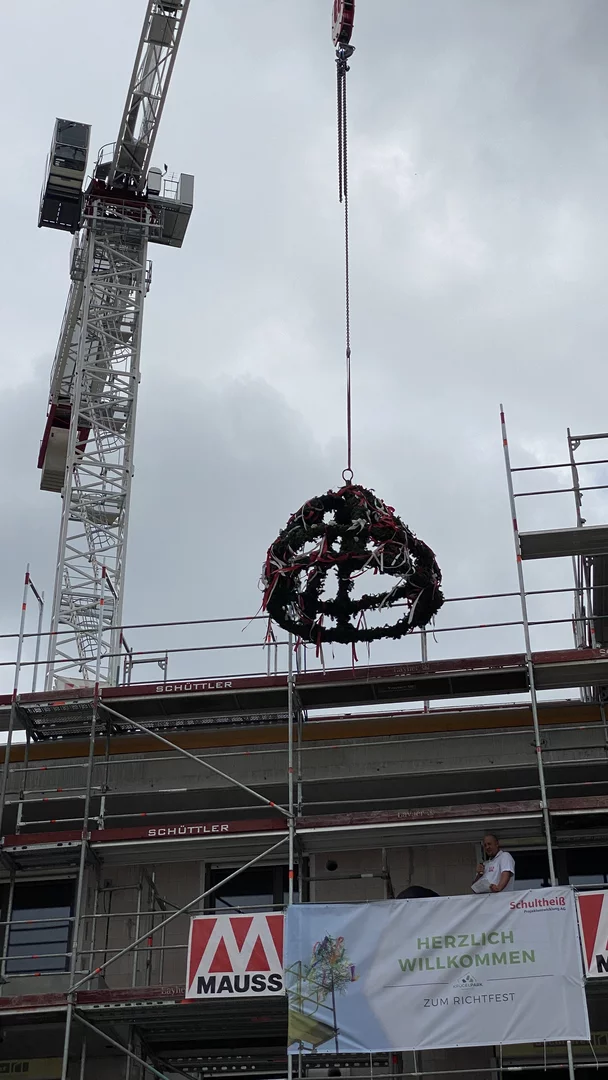 Es handelt sich um das erste Richtfest, das die Schultheiß Projektentwicklung AG auf dem 2 Hektar großen Gelände ausrichtet. Verteilt auf sieben Gebäude, werden bis zum Frühjahr 2024 eine Gesamtwohnfläche von rund 20.400 m² sowie eine Kita mit ca. 1.880 m² Nutzfläche im Innen- und Außenbereich fertiggestellt.„Ich bin schwer beeindruckt, in welchem Tempo der Rohbau für die ersten 69 geförderten Wohnungen und die neue Kita hier im Krügelpark in die Höhe gewachsen ist“, zeigt sich Kurt Krömer, Erster Bürgermeister der Stadt Stein, begeistert. „Ich habe den Baufortschritt vor Ort regelmäßig beobachtet und möchte an dieser Stelle ein großes Dankeschön an den Bauherrn und die hier tätigen Baufirmen richten.“ Dr. Hermann Ruttmann, Vorstand der Schultheiß Projektentwicklung AG, rückt in seinem Grußwort ebenfalls die ausführenden Handwerker und Bauleute in den Fokus. „Der schöne Brauch des Richtfestes ist seit jeher vor allem als Dankeschön an die fleißigen Bauleute gedacht. Unter erschwerten Bedingungen, zunächst aufgrund von Corona, aktuell durch die Auswirkungen des Ukraine-Krieges, wurde hier weiterhin mit Hochdruck an der Rohbaufertigstellung gearbeitet.“