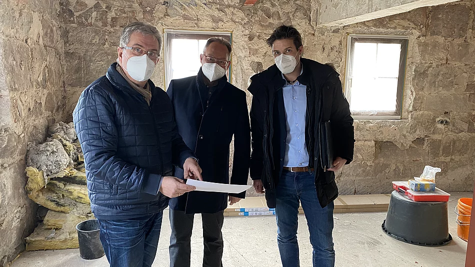 Mit dem Bescheid zur Freigabe der Bauarbeiten von der Denkmalschutzbehörde Anfang Mai 2021 konnte es losgehen. Es gab und gibt einiges zu tun. Der Zugang in das Gebäude wie auch das Erdgeschoß werden behindertengerecht ausgestaltet, so dass die Bürger den Servicebereich barrierefrei betreten können. Da es sich um ein sehr altes, denkmalgeschütztes Gebäude handelt, sind Überraschungen bei den Sanierungsarbeiten unvermeidbar. So gab es einen Holzschädlingsbefall im Bodenbereich des Ergeschoßes, der behandelt werden musste. Statisch bedingt musste auch eine Stahlkonstruktion zur Abstützung der Decken in das Gebäude über alle drei Stockwerke eingezogen werden. An den Fassadenwänden wird ein Wärmeputz an den Innenwänden aufgebracht, um auch hier eine dämmende Funktion zu erreichen. Durch die niedrig angebrachten Fenster wird die Beheizung über eine Fußbodenheizung erfolgen, da entsprechende Heizkörper an den Wänden nicht montiert werden können. Da es sich um ein Sandsteingebäude handelt, das sich an den heißen Sommertagen stark aufheizen wird, werden die Büroräume klimatisiert. Auf zwei Stockwerken werden im Laufe des Jahres die Mitarbeiter des Kulturamtes in die Untere Wassergasse 3 einziehen.