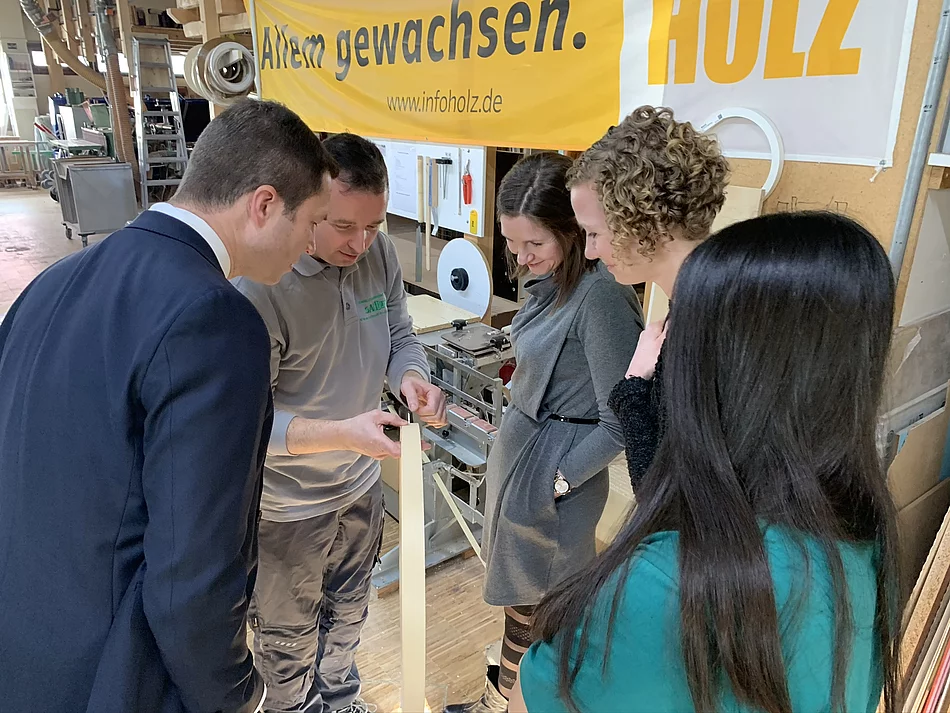 Im Rahmen seiner Firmenbesichtigung hat Landrat Matthias Dießl die Schreinerei und Einrichtungswerkstätte Sauber in Stein besucht. Begleitet wurde er dabei von Steins Wirtschaftsförderin Anne Kratzer