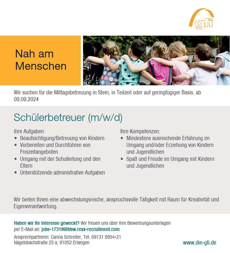 Die Gesellschaft zur Förderung beruflicher und sozialer Integration (gfi) gemeinnützige GmbH sucht ab dem 09.09.2024 engagierte Schülerbetreuer (m/w/d) für die Mittagsbetreuung in Stein.
