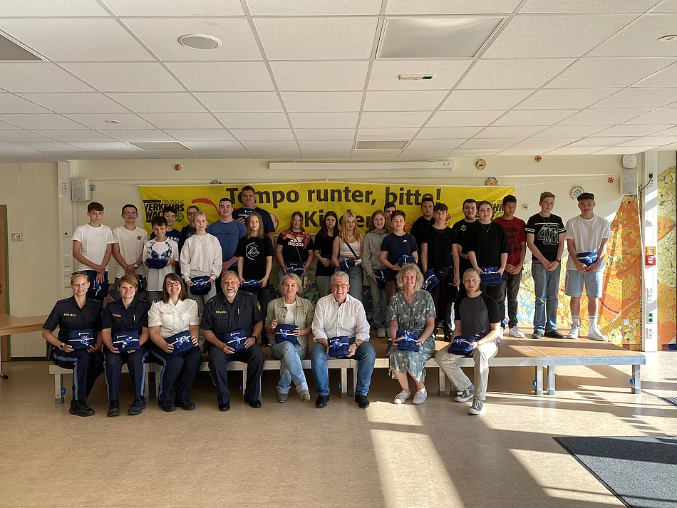 Geehrt wurden 32 Schüler:innen der 7., 8., und 9. Klassen – somit ein Viertel aller Schüler:innen der Mittelschule. Anwesend waren neben den Schülerlotsen und Vertretern der Schule sowie Polizei, auch Erster Bürgermeister Kurt Krömer, der sich mit dankbar an die Ehrenamtlichen wandte: „Wir sind stolz, dass wir mit eurer und ihrer Hilfe keine Schulwegunfälle zu verzeichnen hatten. Dies ist nicht zuletzt dem Engagement der freiwilligen Helfer und Lotsen zu verdanken. Ich hoffe, dass es auch in den folgenden Jahren immer genug Menschen geben wird, die sich für diese Aufgabe zur Verfügung stellen“, so Krömer. Für den täglichen ehrenamtlichen Einsatz dankte Kurt Krömer mit einem kleinen Geschenk in Form eines Badehandtuches.