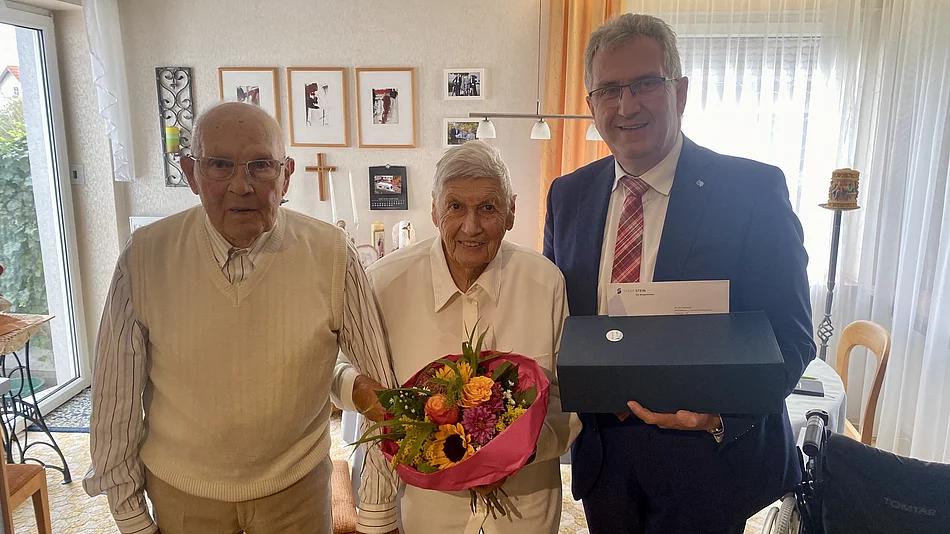 Bürgermeister Krömer würdigte die außergewöhnliche Lebensleistung des Paares: „Herzlichen Glückwunsch zu diesem besonderen Jubiläum! Ihre Ehe zeigt, wie stark man zusammen sein kann. Ich wünsche Ihnen noch viele erfüllende Tage.“ Im Namen der Stadt Stein überreichte er den beiden Blumen und Geschenke, sowie ein Präsent des Landrates Bernd Obst.