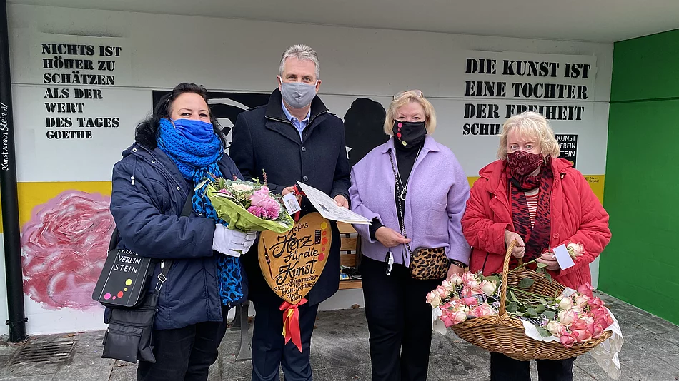 "Die Haltestelle Schillerstraße soll schöner werden", mit dieser Idee und dem Vorschlag selbige zu gestalten wendete sich Dorothea Prüglmeier vom Kunstverein Stein e. V. an Kurt Krömer. Der Erste Bürgermeister der Stadt Stein war von diesem Vorschlag sofort angetan und unterstützte dieses Vorhaben. So wurden Entwürfe des Kunstvereins betrachtet und zur Bewertung ausgestellt. Am Ende entschied sich der Stadtrat für den Entwurf von Melanie Maar mit dem Thema: "Goethe, Schiller und die Kunst – Ein Denkmal für die Kunst." Dies brachte die Überlegung die gemeinsame Kunstthematik von Schiller und Goethe zu verbinden – ebenso wie sich in Deutenbach, die Straßen der beiden Dichter verbinden. Mit diesem Ansatz ging es schließlich ans Werk. Nachdem der Bauhof die noch vorhandenen Schmierereien beseitigte und die Fläche gestrichen hat, begannen die intensiven Vorbereitungen bezüglich Schriftenauswahl, Gestaltung und Farbauswahl. Dann innerhalb eines Tages, wurde aus der Idee schließlich Realität. Entstanden ist ein Kunstwerk, das den Betrachtern an einer ungewöhnlichen Stelle, nämlich einer Bushaltestelle, Kultur und Kunst vermittelt. Kurt Krömer findet bei der offiziellen Besichtigung nur lobende Worte: "Ich bin begeistert, denn damit haben wird Kunst im öffentlichen Raum, die für jeden zugänglich ist. Ich danke dem Kunstverein Stein e. V., im speziellen Melanie Maar, für die tolle künstlerische Arbeit. Hier ist nun ein Ort entstanden, der so viel mehr ist als eine simple Bushaltestelle. Ein Ort der die Wartezeit auf eine wunderbare aber auch zum nachdenken anregende Art verkürzt." Melanie Maar freut sich über diese Worte und ergänzt: "Kunst weckt auf, belebt graue Orte, bewegt und macht Mut. So versucht auch der Kunstverein Stein e. V. diese Kunstbasis zu erhalten und zu fördern." Speziell in diesem Fall, der Haltestelle Schillerstraße, ist es hervorragend gelungen.