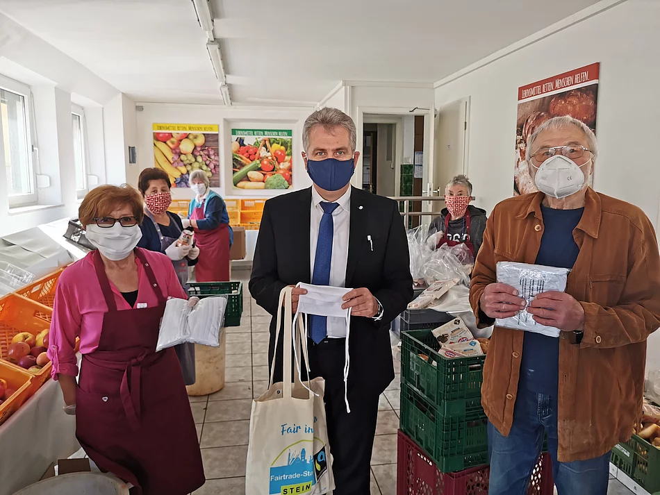 Die Steiner Tafelausgabestelle hat im Dezember 2018 eigene Räume für die Ausgabe von Lebensmitteln erhalten. Wegen des unermüdlichen Einsatzes des gesamten Teams ist sie zu einer wichtigen Steiner Einrichtung geworden. Damit es trotz der schwierigen Umstände weitergehen kann, wurden nun von Bürgermeister Kurt Krömer die unumgänglichen Schutzmasken überreicht.