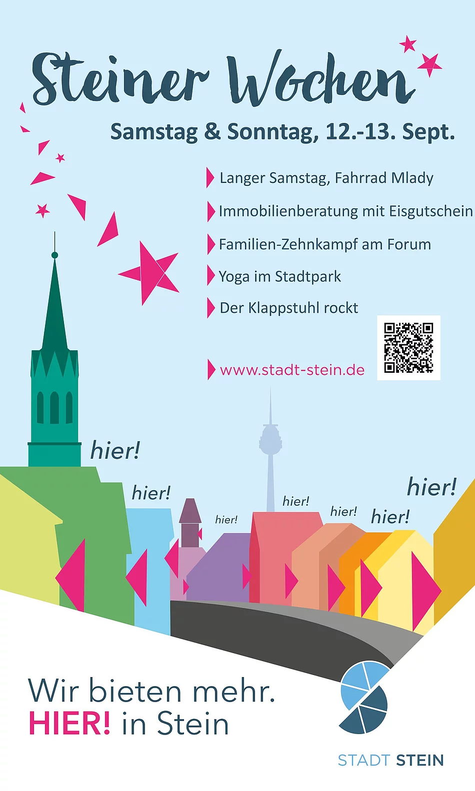 Am Freitag (11. September) geht es gleich los mit leckeren Bowls to go am Forum Eisenstraße. Dann gibt es IM Forum am Samstag den großen Familien-Zehnkampf und gleich gegenüber sollten Sie Fahrrad Mlady einen Besuch abstatten. Denn dort haben Sie im SSV die Möglichkeit auf tolle Räder mit satten Prozenten. Auch sollten Sie im Bedarfsfall die Gelegenheit zur Immobilienberatung nutzen - nicht nur wegen des dazugehörigen Eisgutscheines. Und zum Ausklang am Wochenende empfiehlt sich vormittags Yoga im Stadtpark von 10.30 Uhr bis 11.30 Uhr und schließlich das Highlight am Abend mit der 1. Ausgabe "Der Klappstuhl rockt" 2020 von 19.00 bis 22.00 Uhr auf dem Gelände des BRK. Wir wünschen gute Unterhaltung und natürlich auch ein schönes Wochenende. Alle Infos rund um die Steiner Wochen finden Sie hier