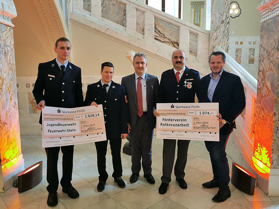 Der Förderverein des Roten Kreuzes darf sich dabei über 1074 Euro freuen. Investiert wird das Geld in das ehrenamtliche Projekt "Fürth drückt", das sich unter anderem zum Ziel gesetzt hat, Kindern einen sicheren Umgang mit "Erster Hilfe" zu ermöglichen. Deshalb bekommt die Mittelschule von dem Geld eine Puppe, an der die Schüler üben können. Armin Schläger, Kassier des Fördervereins der BRK-Bereitschaft, hat den symbolischen Scheck stellvertretend entgegengenommen. Und auch die Jugendfeuerwehr der Feuerwehr Stein darf sich über Unterstützung freuen. Die Summe von 2028,14 Euro wird in das Kreisjugendfeuerwehrzeltlager investiert, an dem mehrere hundert Jugendliche teilnehmen. Entgegengenommen wurde der symbolische Scheck von dem stellvertretenden Kommandanten der Steiner Feuerwehr Peter Bauer und dem Gerätewart Marcus Rupprecht. Zur Scheckübergabe erschien, wie auch in den letzten Jahren, Charles Graf von Faber-Castell, der im Jahr 2016 für seinen verstorbenen Vater Anton-Wolfgang Graf von Faber-Castell in den Stiftungsrat nachgerückt ist. "Mir ist es eine besondere Freude, in der Bürgerstiftung involviert zu sein und es ist mir wichtig diese Tradition fortzusetzen. Denn wir investieren bei der Feuerwehr und dem BRK mit der Spendensumme in die Jugend und Kinder und damit in unsere Gesellschaft, was mich sehr freut", so Graf von Faber-Castell. Steins Erster Bürgermeister Kurt Krömer konnte dem nur beipflichten, verbunden mit einem Dank: "Ein herzliches Dankeschön geht an Graf von Faber-Castell, der im Stiftungsrat zugestimmt hat, diese Projekte zu unterstützen," so Krömer. Als erste Kommune im Landkreis Fürth hat die Stadt Stein im April 2009 eine Bürgerstiftung gegründet. Durch die Bürgerstiftung, der unter anderem auch der zweite Bürgermeister der Stadt Stein Bertram Höfer zugehört, können Projekte gezielt, unabhängig und nachhaltig gefördert und unterstützt werden.