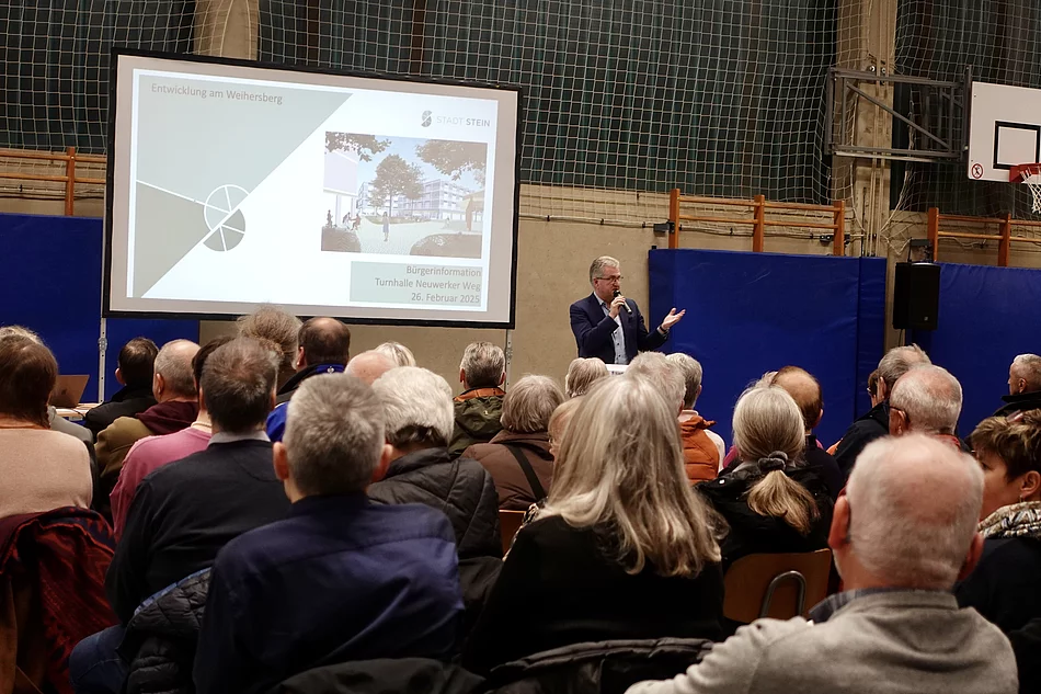 Die Stadt Stein setzt ihren Beteiligungsprozess für das neue Stadtquartier Weihersberg fort. Zur Bürgerinformation am 26. Februar 2025 in der Schulturnhalle am Neuwerker Weg kamen über 200 Steiner Bürgerinnen und Bürger, die sich über den aktuellen Planungsstand informierten und sich mit ihren Ideen aktiv einbrachten.