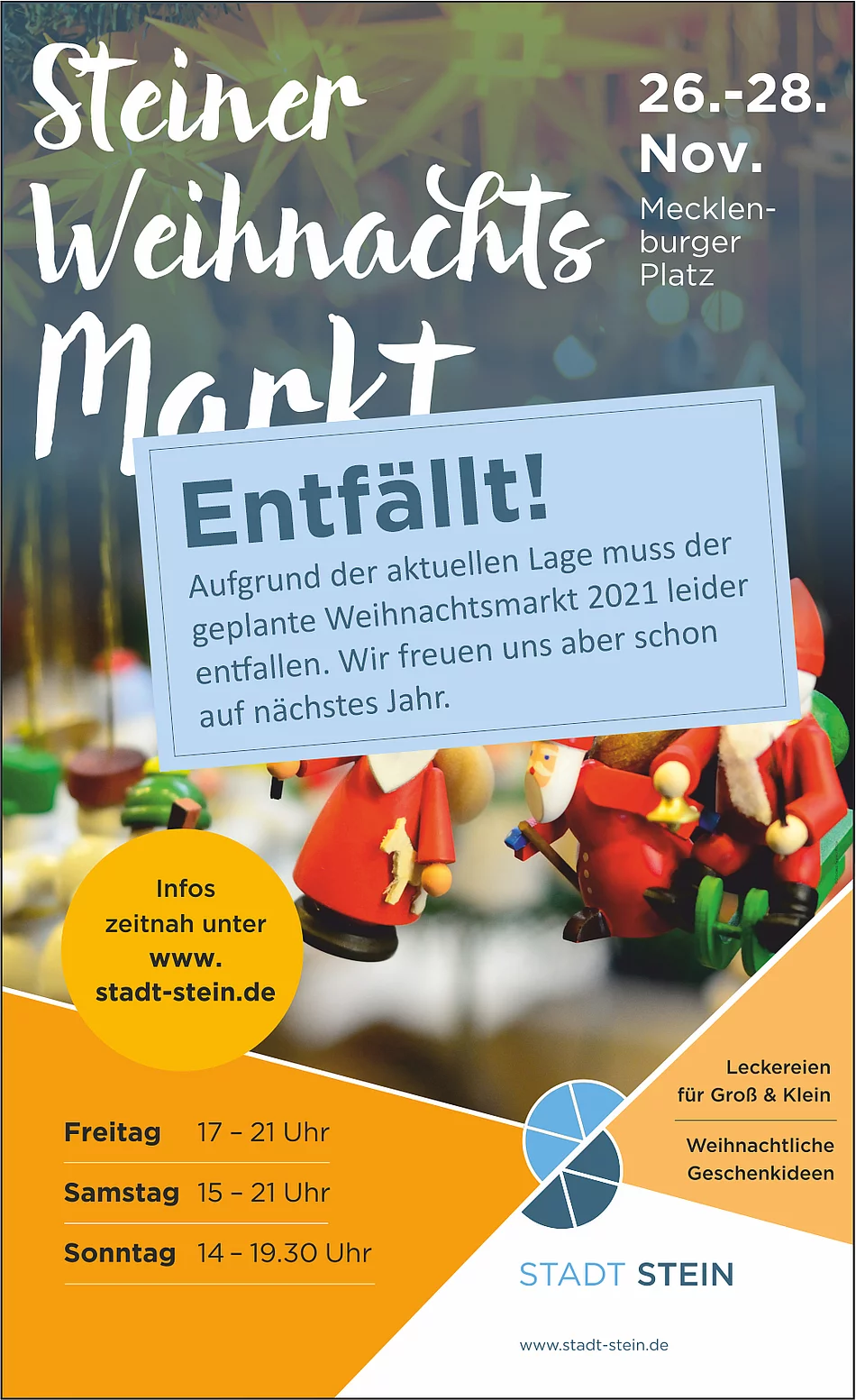"Aufgrund der aktuell immer weiter steigenden Corona-Zahlen, der seit einigen Tagen auf rot stehenden Krankenhausampel und der Ansage von Ministerpräsident Dr. Markus Söder, den Katastrophenfall erneut ausrufen zu wollen, habe ich den Entschluss gefasst, den Steiner Weihnachtsmarkt abzusagen. Sie können mir glauben, dass mir dieser Schritt nicht leichtgefallen ist, da wir alle das Ziel hatten, unseren Bürgerinnen und Bürgern einen Weihnachtsmarkt zu ermöglichen. Ich bitte Sie aber um Verständnis für diese Entscheidung, da für uns der Schutz der Bevölkerung oberste Priorität genießt und wir derzeit in Stein die zweithöchste Zahl an positiv getesteten Personen haben.