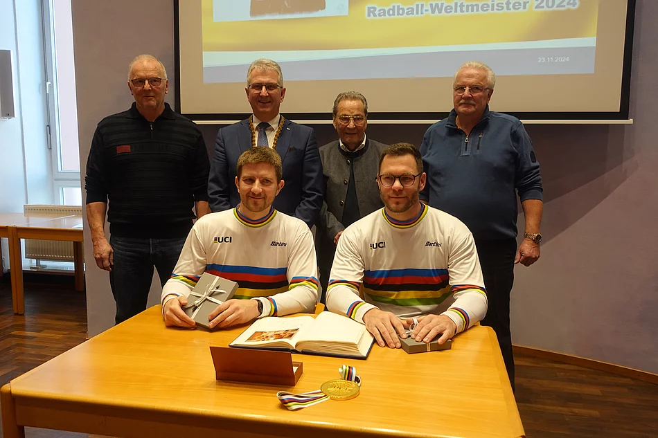Am 23. November trugen sich die neuen Radball-Weltmeister Bernd Mlady und Raphael Kopp im Kultursaal der Stadt Stein ins Goldene Buch ein. In einer feierlichen Zeremonie gratulierte Bürgermeister Kurt Krömer den beiden für ihre herausragende Leistung: „Bernd, du hast mit deinem neuen Spielpartner den Weltmeistertitel erneut nach Stein geholt und damit unsere Stadt wieder auf internationaler Ebene vertreten. Dafür danke ich euch im Namen der Stadt und gratuliere herzlich.“